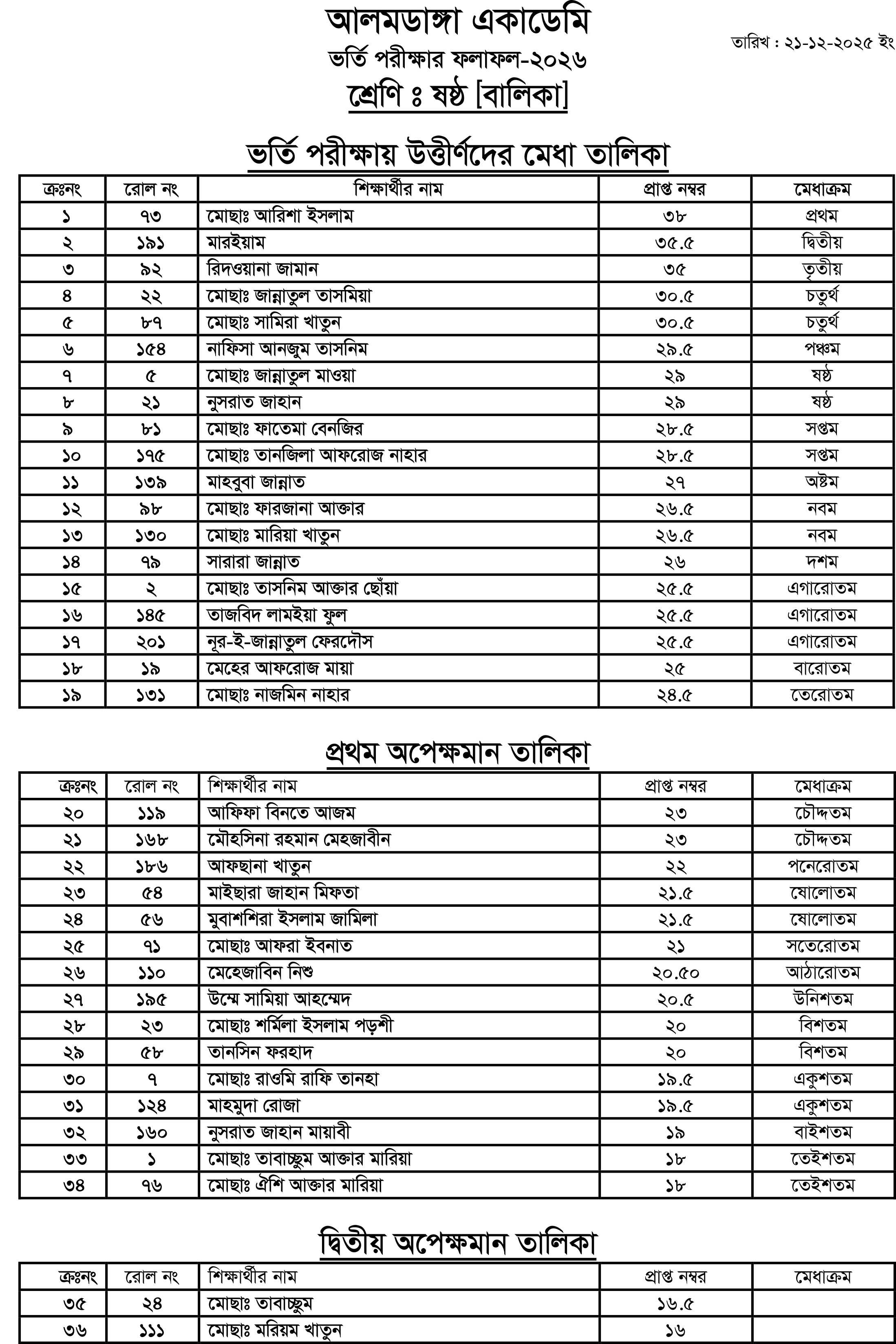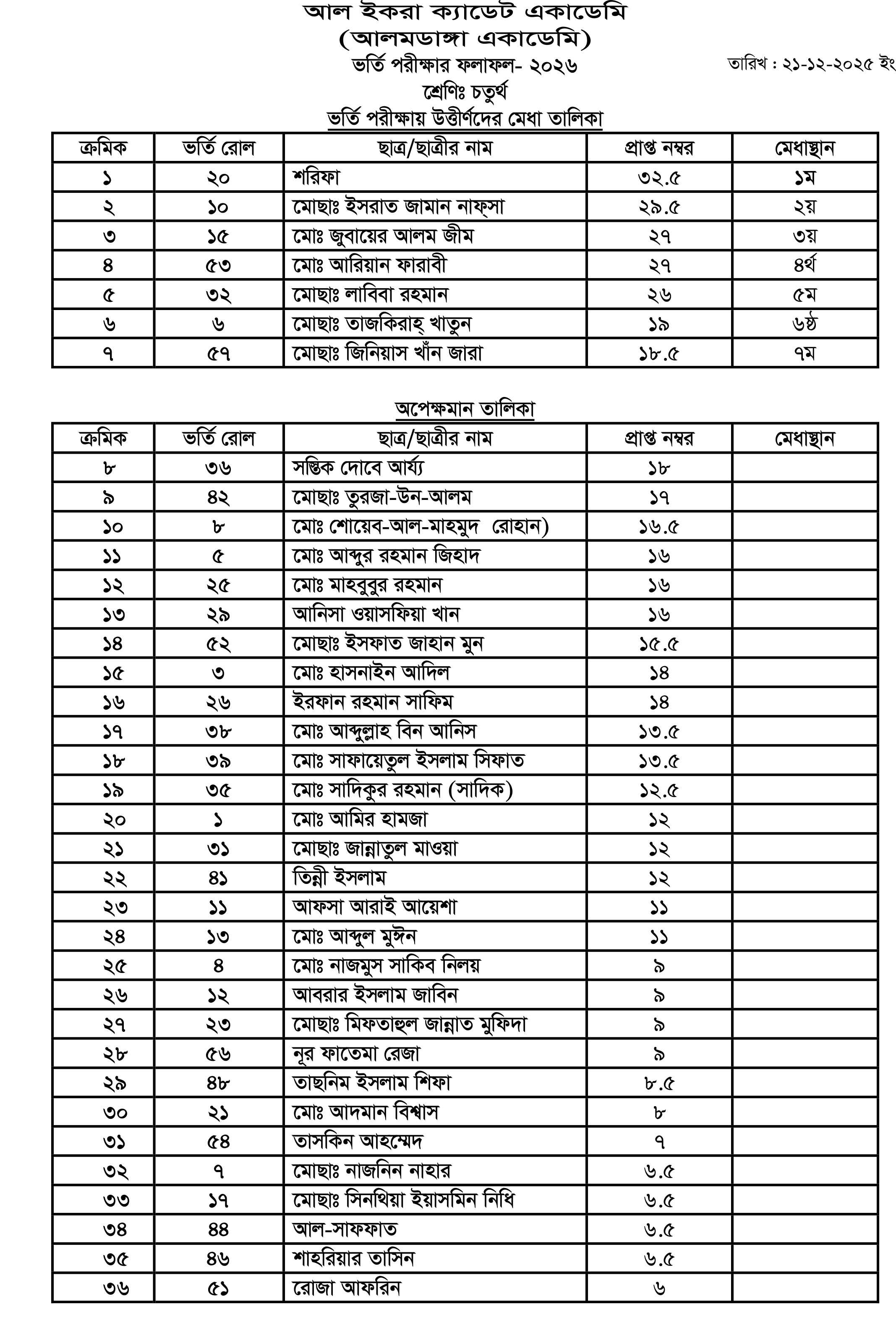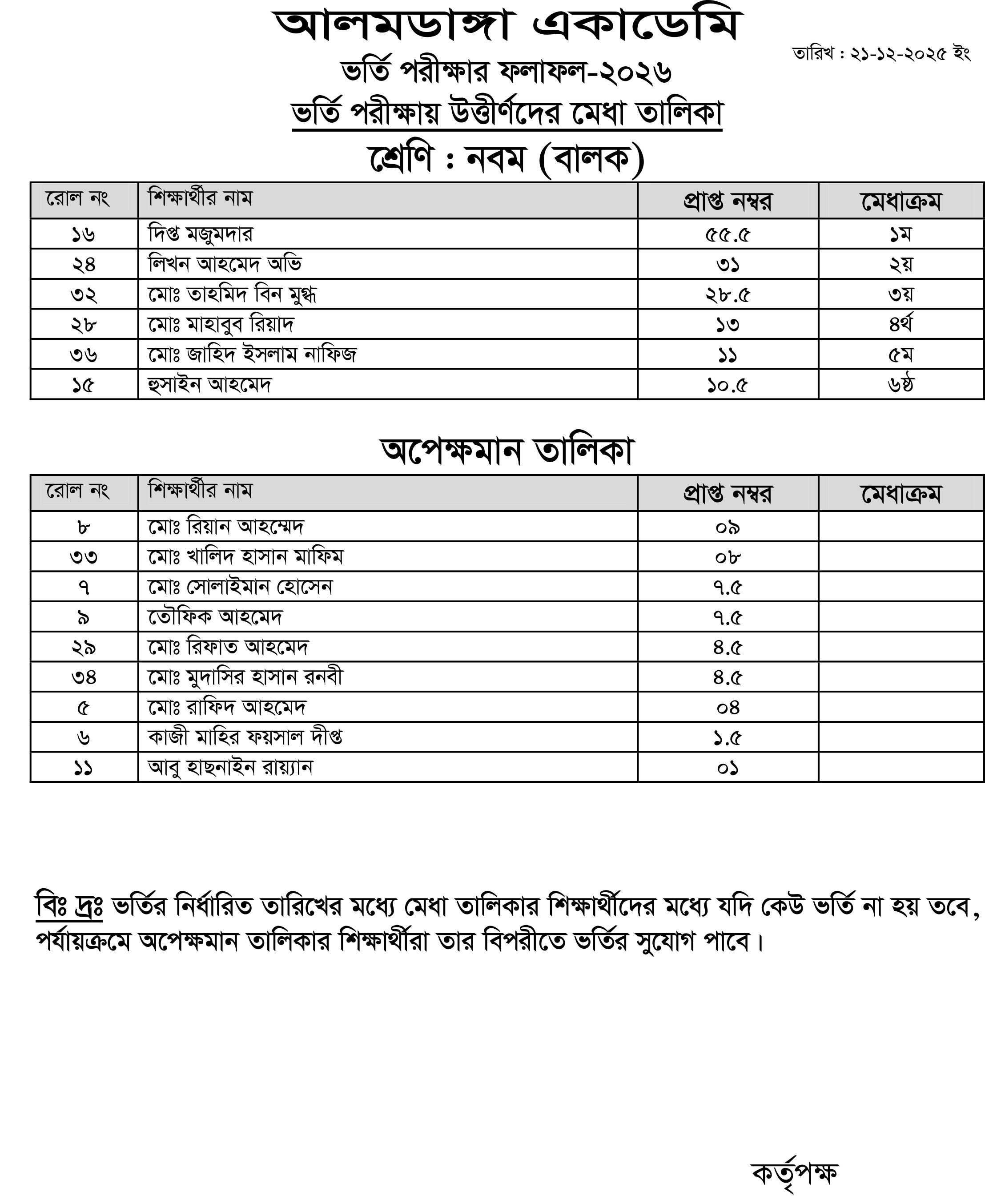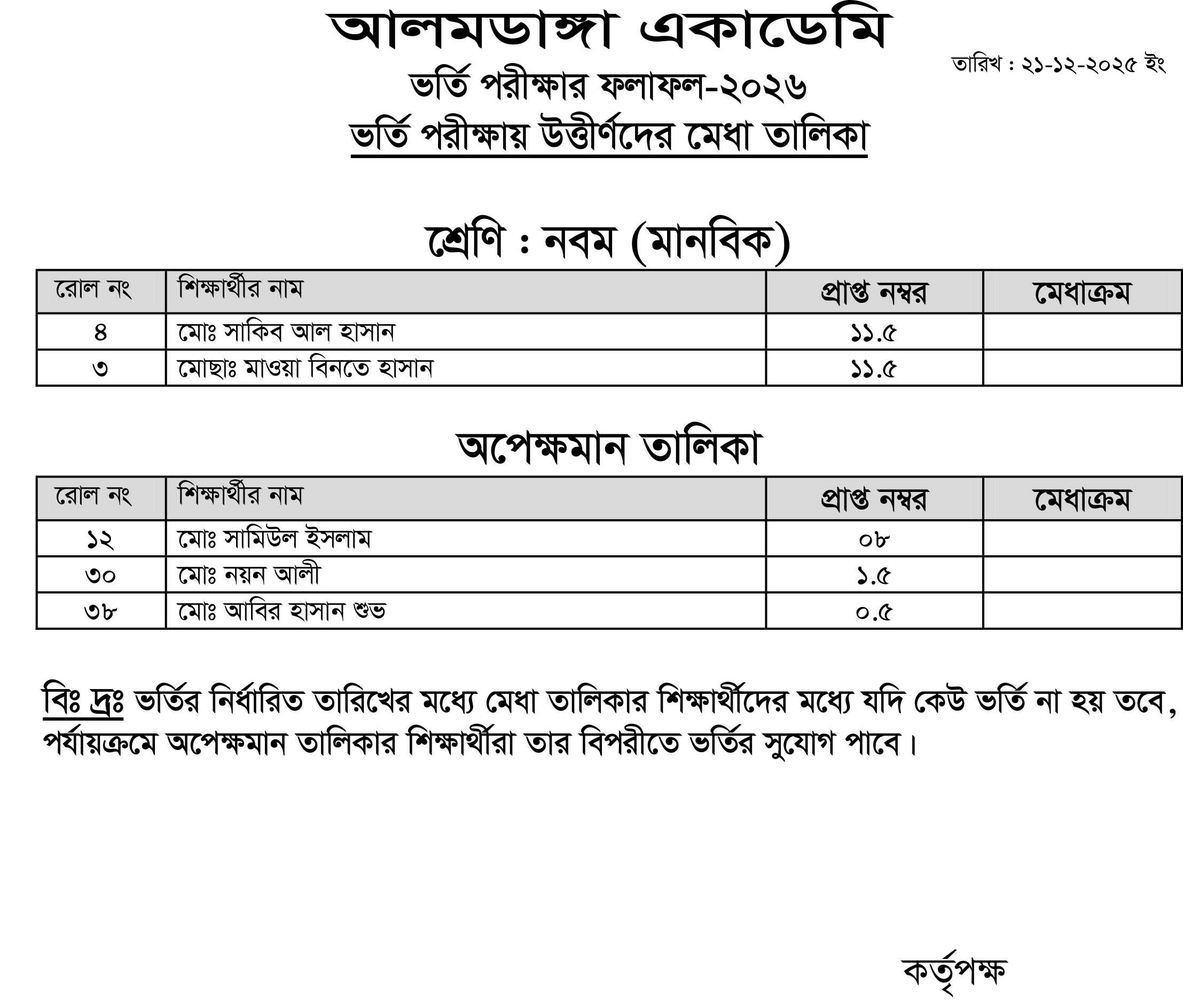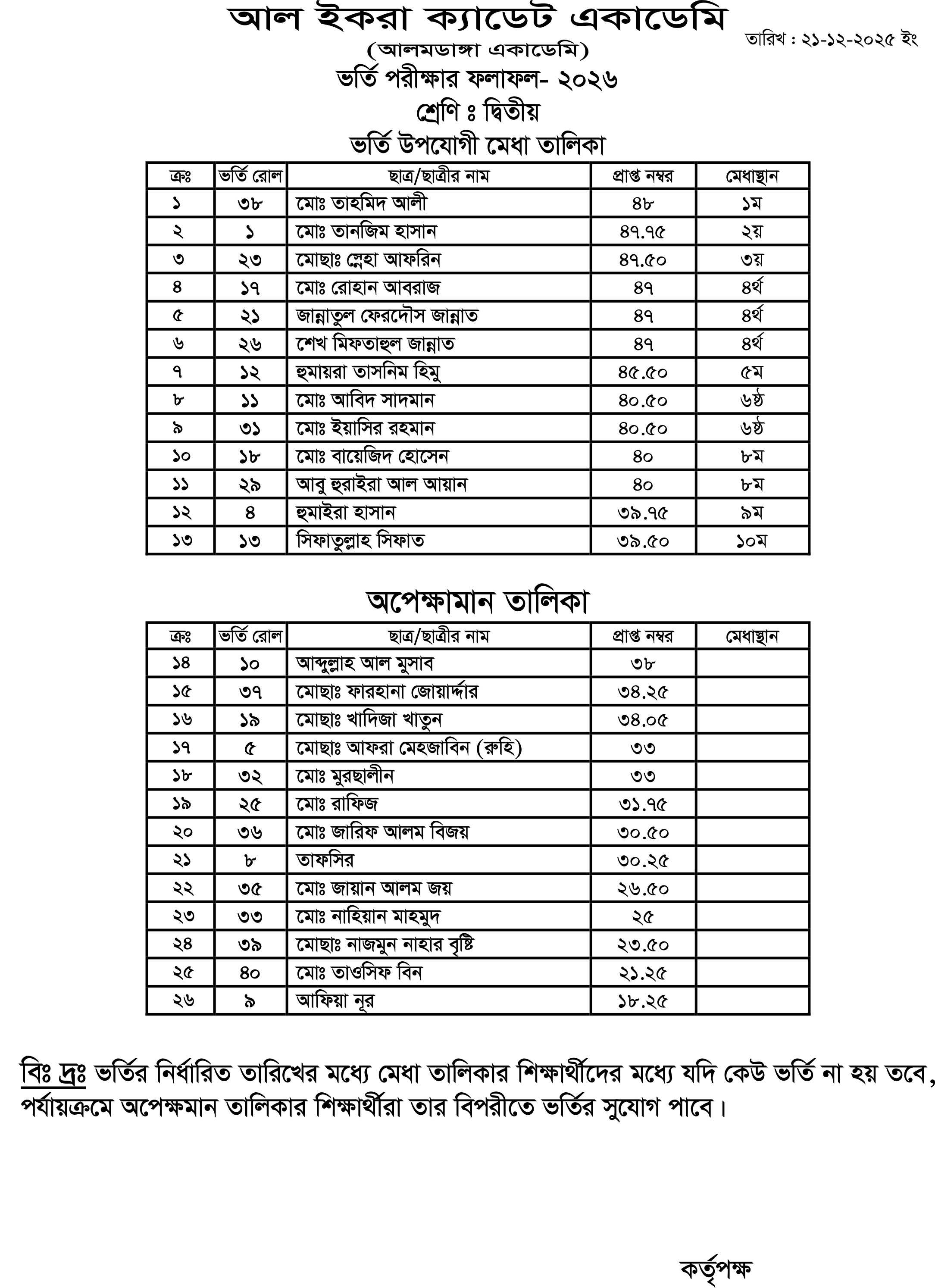 আলমডাঙ্গা একাডেমি ও আল ইকরা ক্যাডেট একাডেমির ভর্তি পরীক্ষা -২০২৬ এর ফলাফল দ্বিতীয়, তৃতীয়, চতুর্থ, পঞ্চম, ষষ্ঠ এবং নবম শ্রেণি