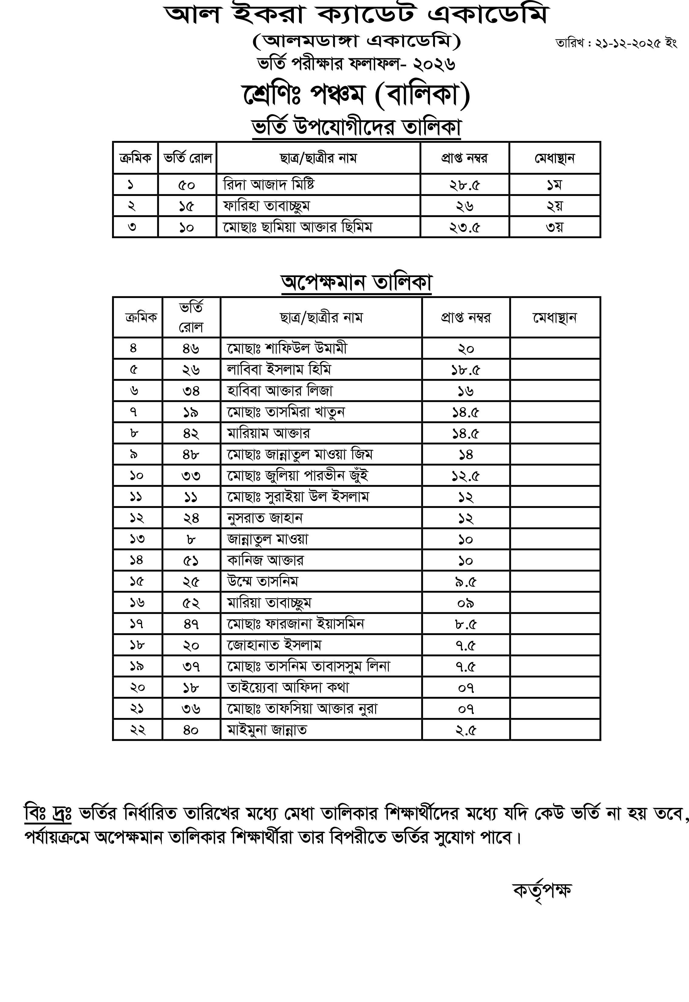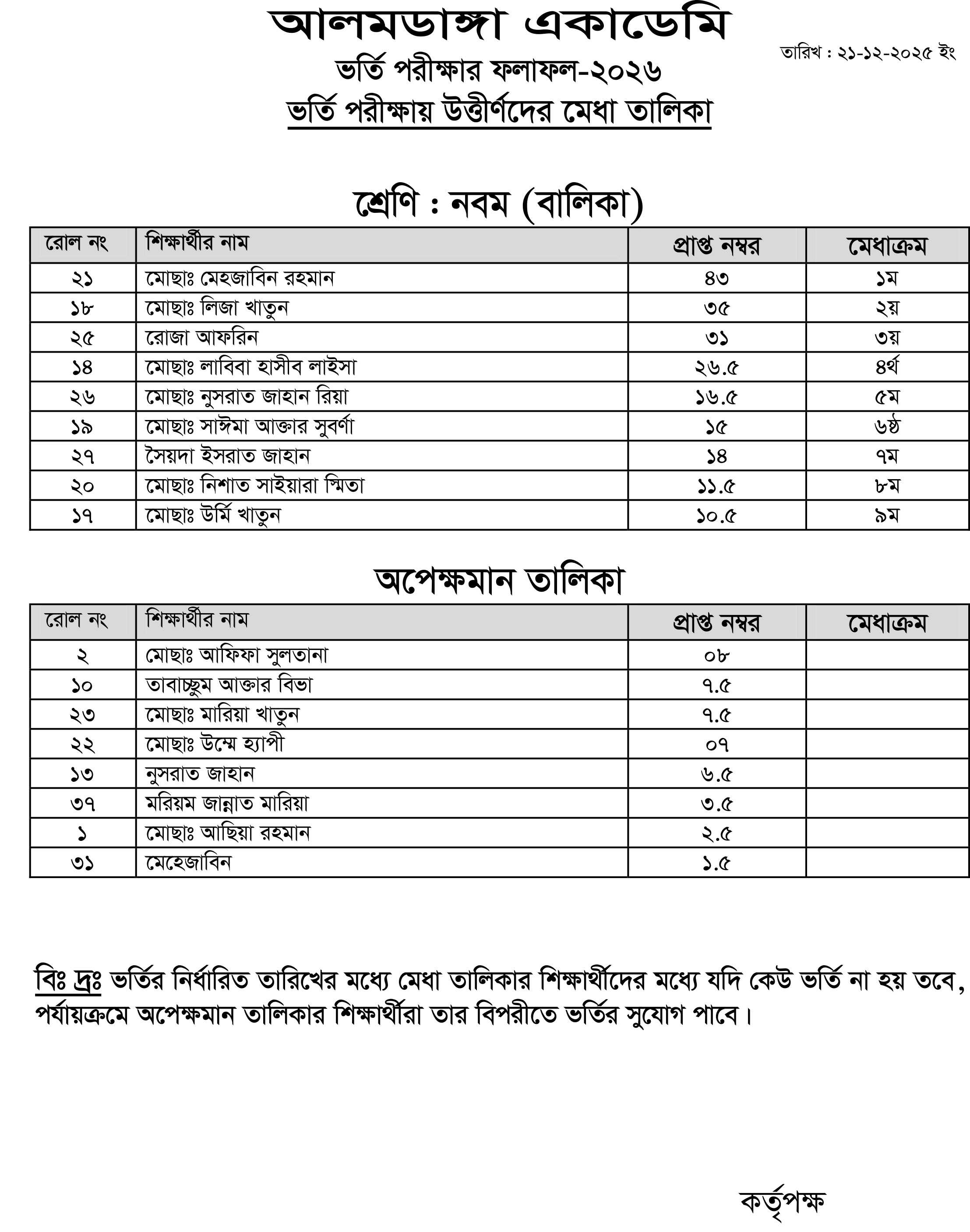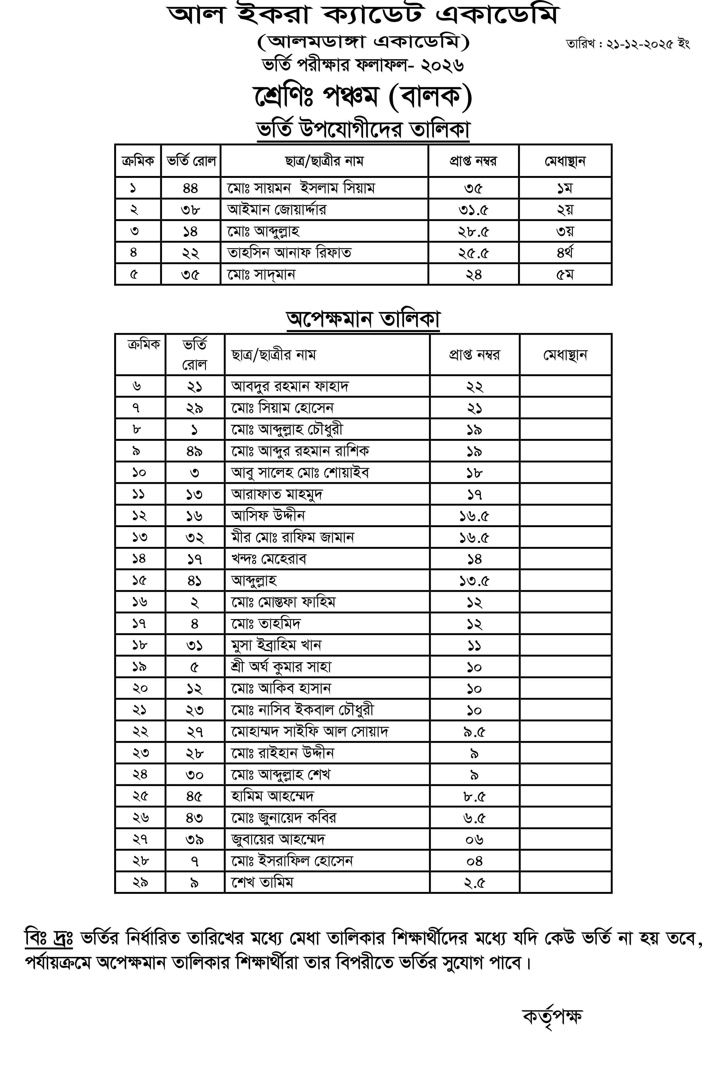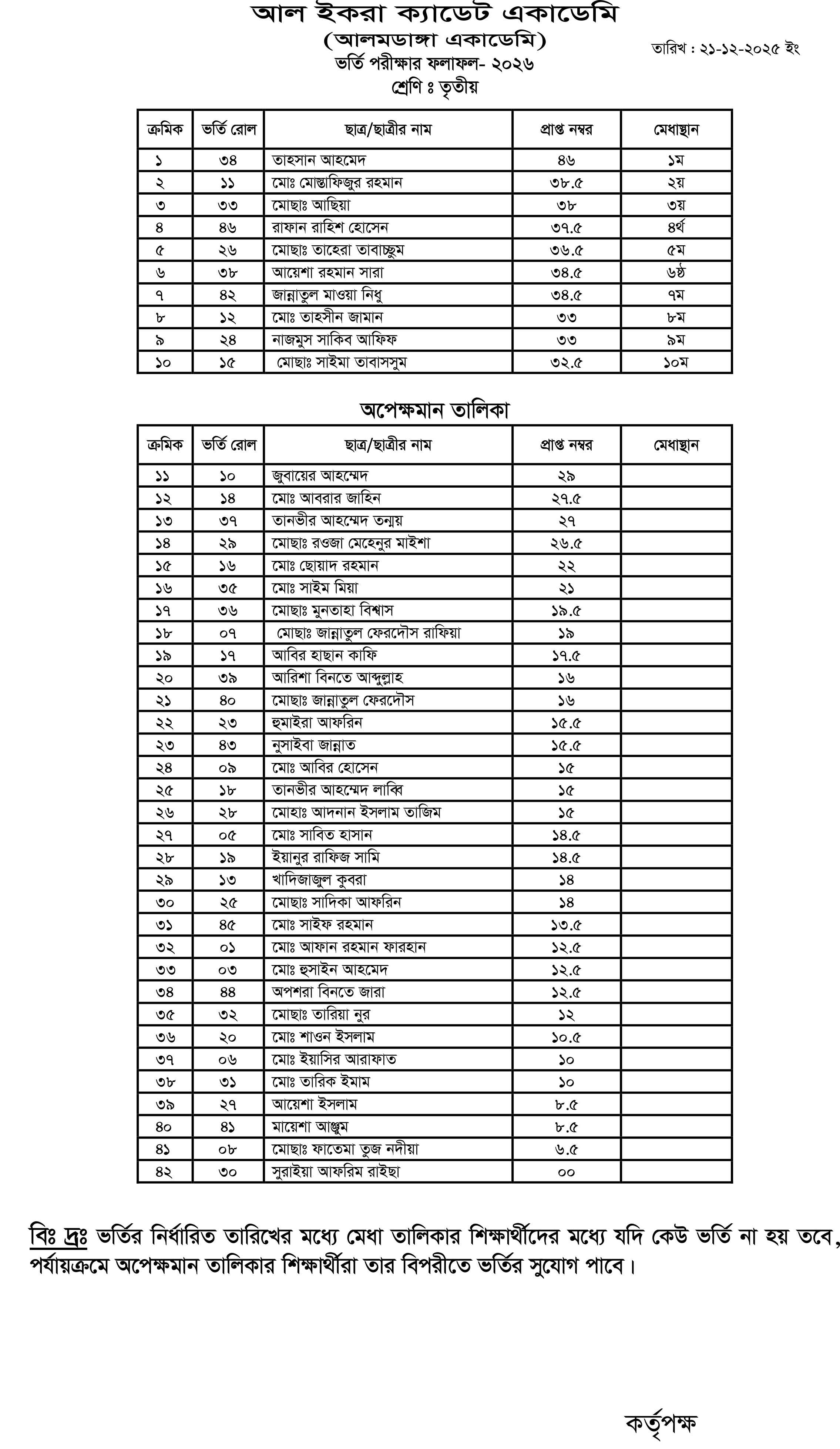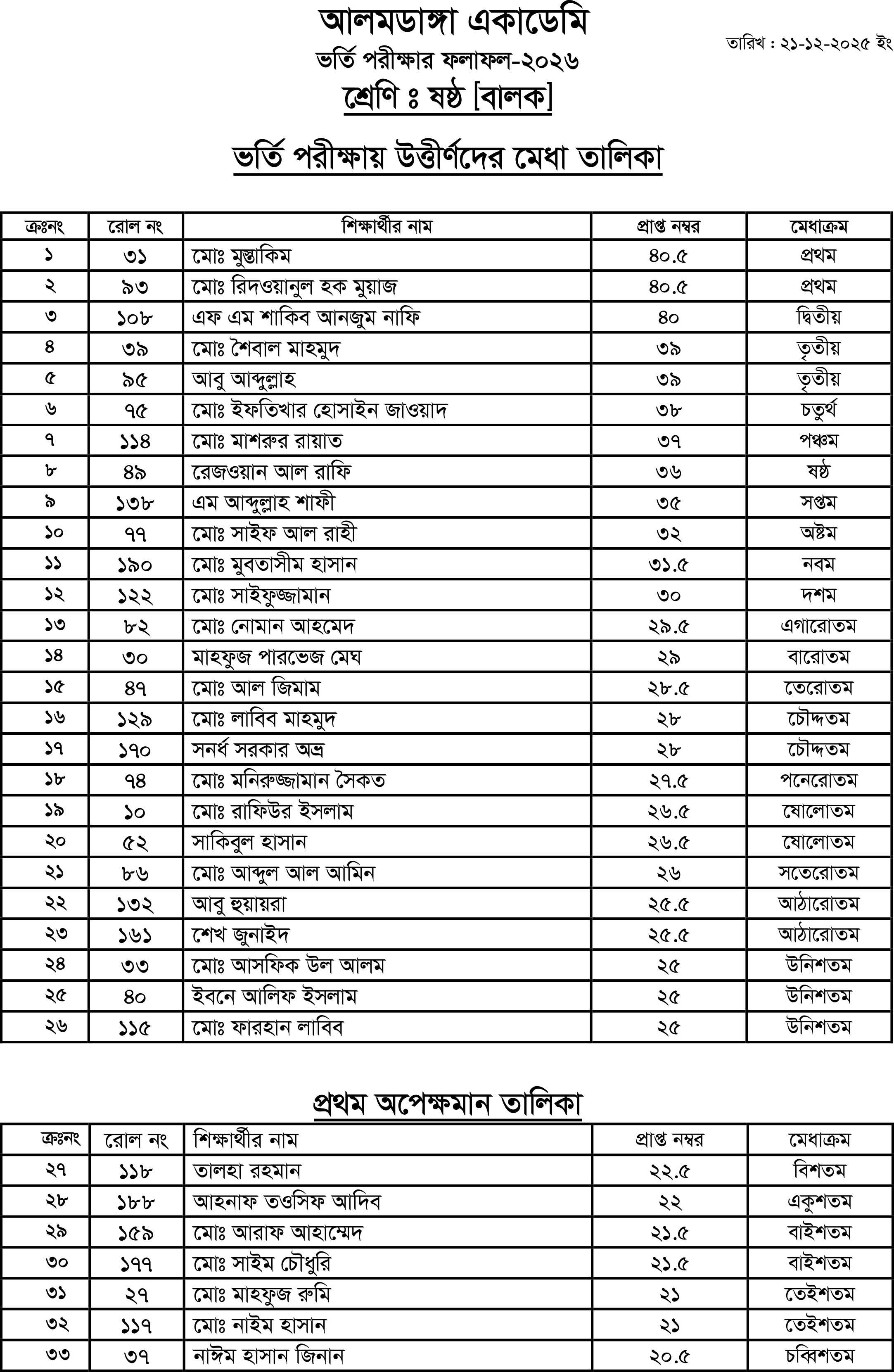 আলমডাঙ্গা একাডেমি ও আল ইকরা ক্যাডেট একাডেমির ভর্তি পরীক্ষা -২০২৬ এর ফলাফল দ্বিতীয়, তৃতীয়, চতুর্থ, পঞ্চম, ষষ্ঠ এবং নবম শ্রেণি